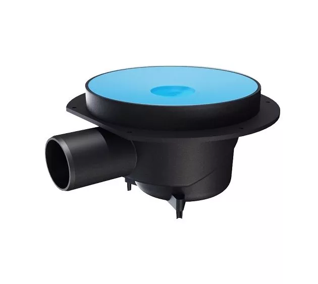 The Vieser horizontal drain is equipped with a DN50 or DN75 outlet connection. The package includes the drain, water trap, casting cover, wedge ring, gasket, and the installation tool for the wedge ring.